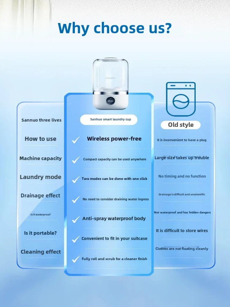 The capacity of the laundry cup is about [1.2L]. It uses Type-C port charging, and is equipped with a 4000 mAh battery. When fully charged, the gentle mode can be washed about 18-20 times, and the strong washing mode can be washed about 8-10 times.